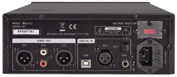 W tym przypadku poziom sygnału na wyjściach analogowych nie jest regulowany. Z tyłu - gniazda wyjściowe analogowe RCA i XLR, wejścia cyfrowe USB typ B, XLR, TOSLINK oraz RCA. Jest też gniazdo sieciowe IEC.