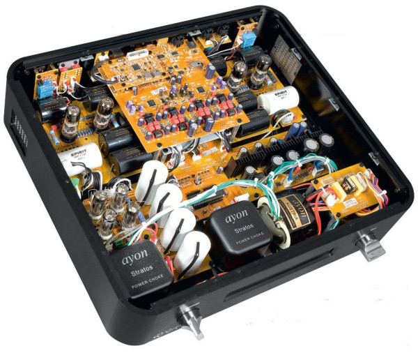 Zbalansowaną konstrukcję Ayon Audio Stratos widać na pierwszy rzut oka (oczywiście po jej rozkręceniu). Poszczególne układy zmontowano na osobnych płytkach, ale wszystkie podstawowe moduły są podwójne.