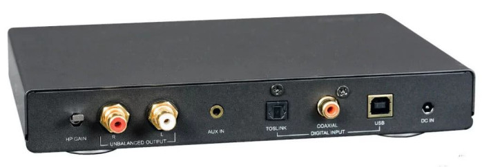 Ostatnia sygnalizuje, czy sygnał USB nie został zmieniony ("bit pefect"). Między wejściami przełączamy jednym przyciskiem. Wejścia cyfrowe to USB, koaksjalne RCA oraz optyczne. Jest także wejście analogowe, na 3,5-mm gnieździe mini-jack. Obok widać wyjścia analogowe RCA - znacznie wyższej klasy i w całości złocone.