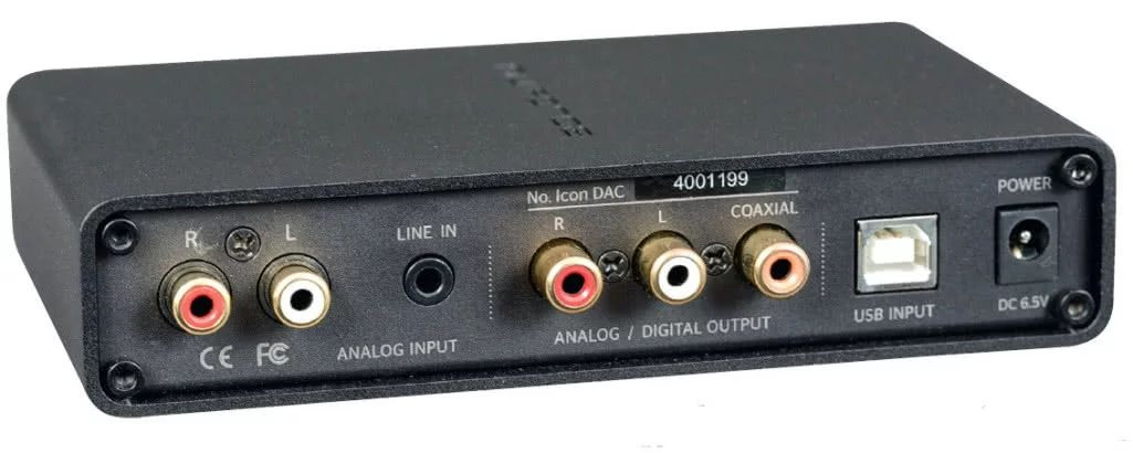 Zestaw gniazd z tyłu jest dość niespotykany; jest tam wejście USB, przyjmujące sygnał do 24/96 i DSD oraz wejścia analogowe mini-jack i RCA. Obydwa są podłączone równolegle. Są też wyjścia analogowe RCA i cyfrowe S/PDIF RCA - zatem urządzenie może pracować także jako konwerter USB-S/ PDIF. Zasilaniem zajmuje się ścienny zasilacz 6,5 V DC.