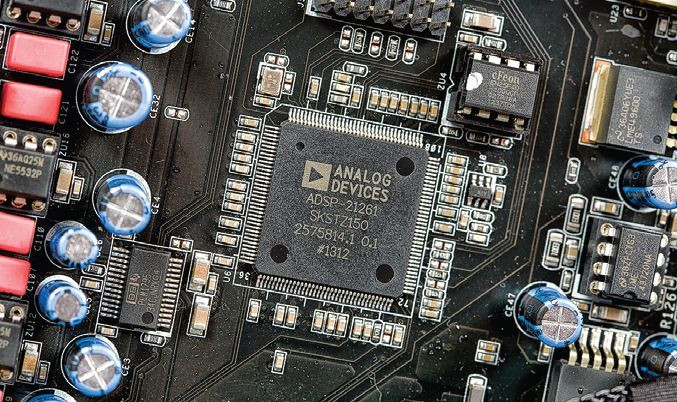 Po skonwertowaniu na PCM lub z pozostałych wejść, sygnał trafi a do odbiornika cyfrowego AKM AK4413, a stamtąd do dużego układu DSP Analog Devices ADSP- 21261, w którym znajdują się filtry cyfrowe i upsampling.
