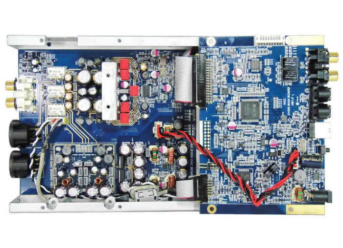 We wnętrzu przetwornika widać dwie płytki, choć bez zasadniczego podziału cyfrowo-analogowego. Sygnały akceptuje górny moduł, w którym najważniejszą rolę odgrywa interfejs wejściowy na bazie popularnego procesora XMOS. Funkcję rozdzielni danych cyfrowych pełni z kolei scalak AKM-a.