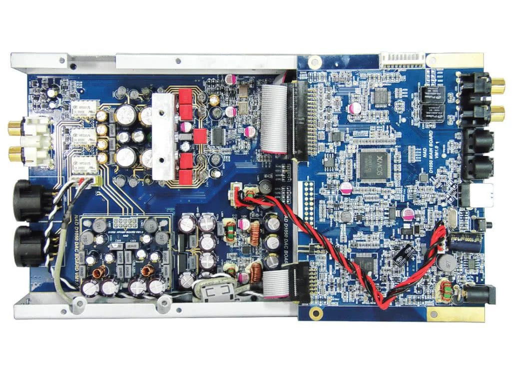 Wstępnie przygotowane sygnały płyną do drugiej płytki, na której osadzono kompletną sekcję analogową, a także przetwornik C/A. Scalak Cirrus Logic CS4398 nie jest może konstrukcją najnowszą, jednak wciąż imponuje parametrami, teoretyczna maksymalna dynamika sięga 120 dB, a oprócz PCM 24/192, potrafi obsłużyć także sygnały DSD, czego jednak w przetworniku NAD D1050 nie wyegzekwowano.
