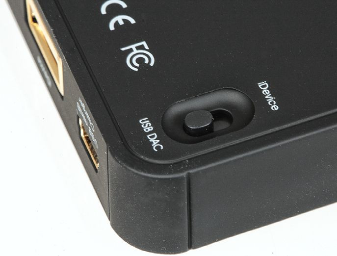 Wyboru wejścia (USB do komputera lub USB dla iUrządzeń Apple) dokonujemy małym hebelkiem na spodzie urządzenia.