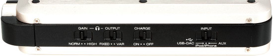 Z przodu zainstalowano pokrętło regulujące wzmocnienie, które jest zintegrowane z włącznikiem zasilania (jak w starym "radiu tranzystorowym"), gałka również jest metalowa. Tuż obok niej znajduje się złocone gniazdo słuchawkowe mini-jack, jednocześnie jedyne analogowe wyjście.