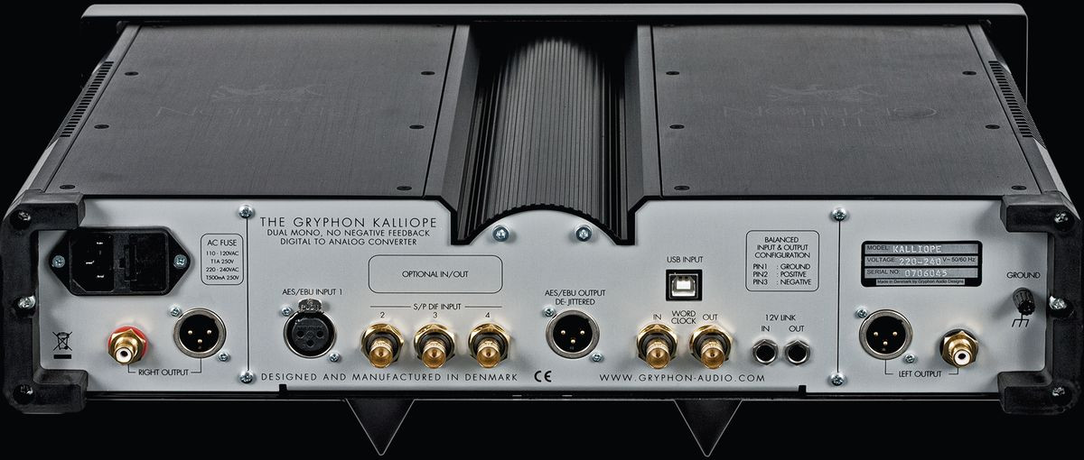 Z "lwiego" sprzętu audio płyną na ogół setki (lub tysiące watów), jednak Gryphon zajmuje się również produkcją zespołów głośnikowych i źródeł. Przez dłuższy czas były to głównie odtwarzacze, teraz uzupełniane przetwornikami cyfrowo-analogowymi. Kalliope jest najlepszym z nich i jednym z najdroższych tego typu urządzeń na rynku.