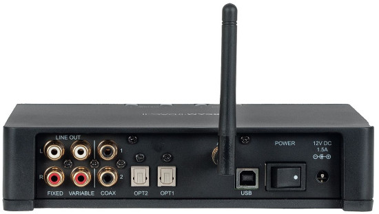 Na tylnej ściance nie ma dużego gniazda sieciowego - zasilacz jest zewnętrzny. Dwa wyjścia analogowe – jedno ze stałym, a drugie z regulowanym poziomem. USB-B jest, jak zwykle, wejściem pozwalającym przesłać sygnały o najwyższych parametrach; w tym przypadku PCM 24 bit/384 kHz oraz DSD128. Typowa antena dla systemów bezprzewodowych służy tutaj komunikacji Bluetooth.