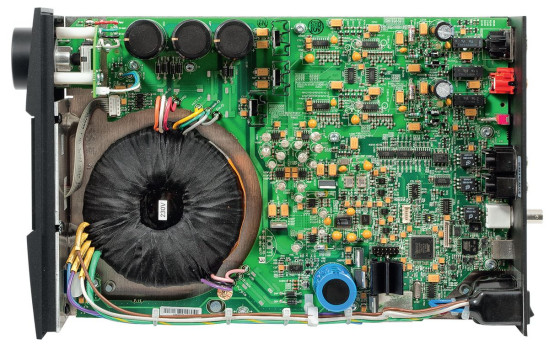 Większość obwodów zmontowano na jednej, wypełniającej niemal całe wnętrze płytce drukowanej. Wejście USB obsługuje dość nietypowy układ marki Atmel. Sygnały nie tylko z portu USB, ale i z pozostałych wejść cyfrowych trafiają do procesora Analog Devices z rodziny Sharc o oznaczeniu ADSP-21489.