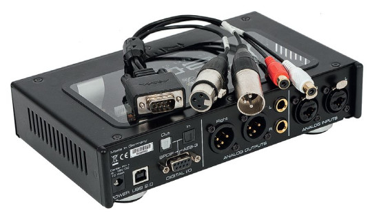 Wejścia cyfrowe obejmują wprawdzie znajomy i najważniejszy standard USB 2.0 (gniazdo USB-B pełni tutaj nie tylko rolę wejścia), a także jedno gniazdo optyczne (jest też optyczne wyjście), ale też port RS232, w którym... zaszyto kolejne standardy - współosiowy oraz AES/EBU (w każdym po jednym wejściu i wyjściu); z gniazda RS232 wydobędziemy je, korzystając z dołączonej do zestawu przejściówki.
