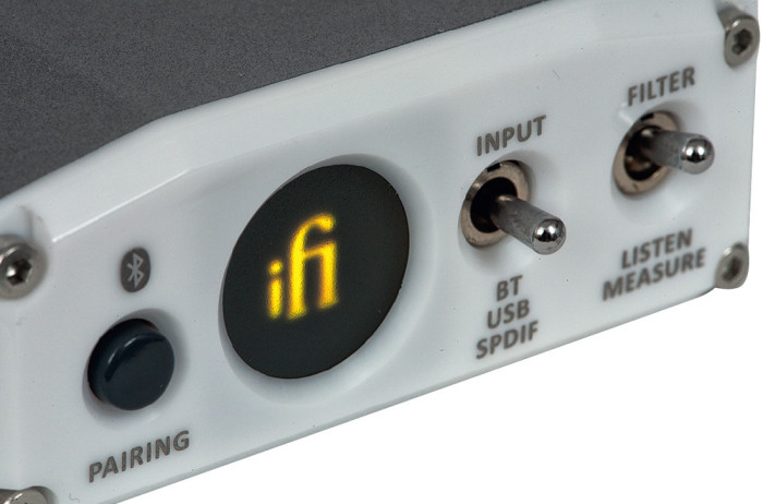 Parowanie Bluetooth uruchamiamy przyciskiem, na froncie ifi Audio iOne Nano są jeszcze dwa przełączniki hebelkowe oraz okrągłe "oko" z podświetlonym logo iFi Audio. Jest to oryginalny wskaźnik parametrów sygnału cyfrowego - częstotliwość próbkowania zakodowano w zmieniających się barwach (podobnie jest w Dragonfly).