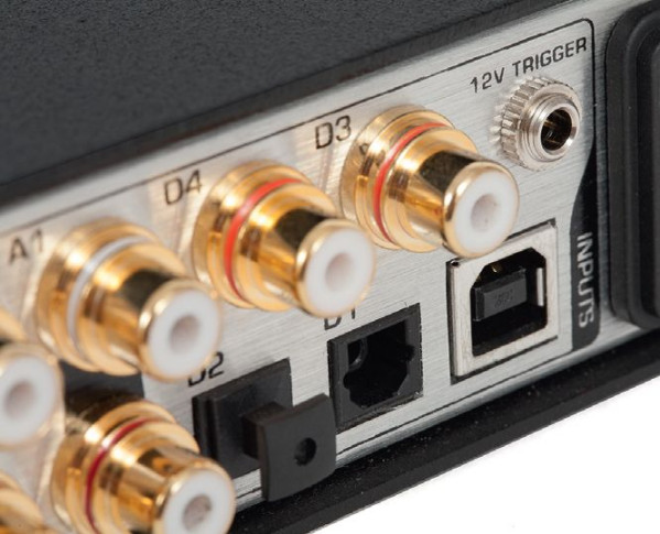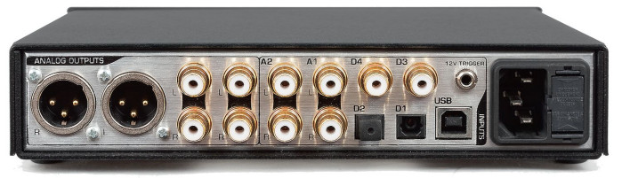 Wyjścia analogowe są w sumie trzy – jedno XLR i dwa RCA – regulowane lub o stałym poziomie napięcia (w zależności od ustawień), a wejść cyfrowych nominalnie aż pięć – dwa optyczne, dwa współosiowe i jedno USB – przy czym jedno z wejść współosiowych może zamienić się w cyfrowe wyjście (na którym mamy sygnał z aktywnego wejścia). Są też analogowe wejścia, dwie pary RCA.