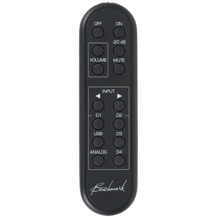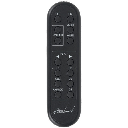 W komplecie z Benchmarkiem DAC3 HGC jest wygodny pilot, który pozwala na wybór wejść, regulację głośności (z szybkim całkowitym wyciszeniem bądź 20 dB tłumieniem) oraz włączanie (i wyłączanie).