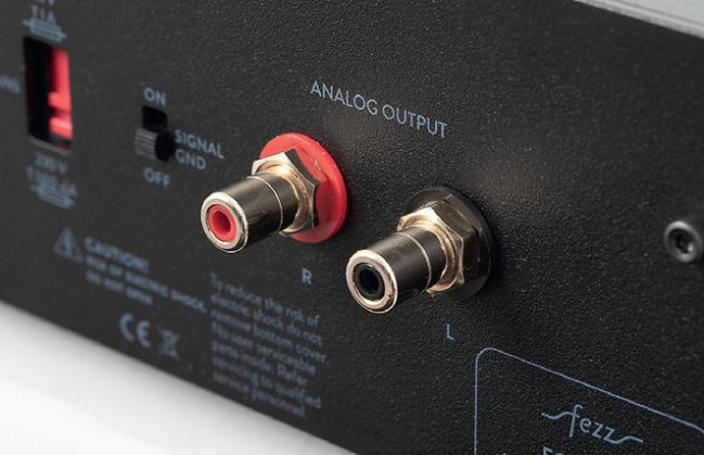 Na tylnej ściance przetwornika Fezz Audio Equinox EVO znajdują się cztery gniazda wejściowe, dwa optyczne, jedno współosiowe i jedno USB-B. Wyjścia są wyłącznie analogowe, w standardzie RCA.