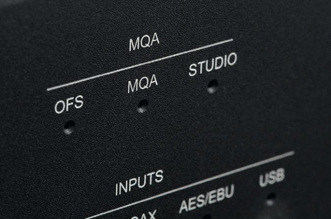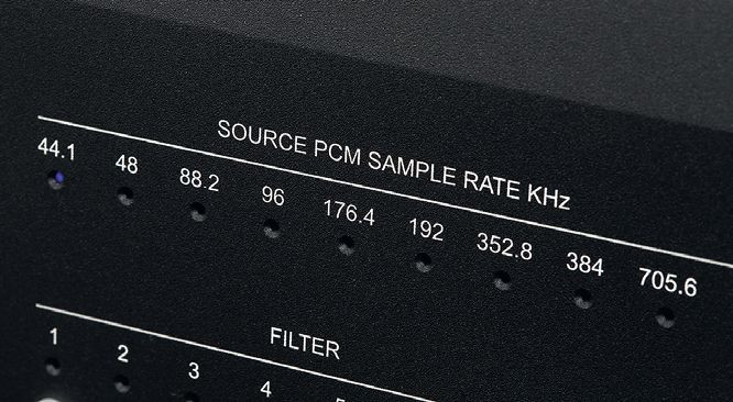 Cała sekcja diod informuje o częstotliwości próbkowania dla sygnałów PCM oraz wariancie strumieni DSD. W pierwszym przypadku sięgamy aż 768 kHz, a maksymalna rozdzielczość wynosi 32 bity. W drugim mamy DSD512, do tego dochodzi dekodowanie MQA.