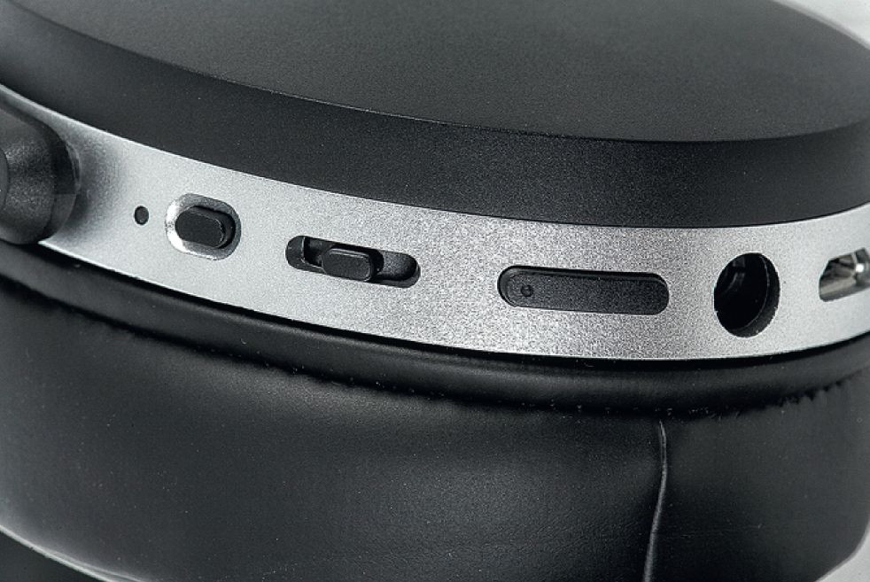Dwa dodatkowe przyciski (połączone w jeden szeroki dwupolowy element) regulują głośność. W prawej muszli znajdują się również wejście dla sygnałów analogowych oraz port USB do ładowania.