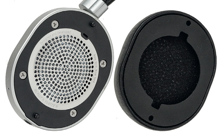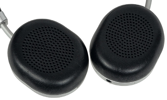 Poduszki słuchawek Master & Dynamic MW50 łatwo "zapadają się" w środku, na obwodzie są usztywnione sprężystym, piankowym wypełnieniem. Tajemniczo prezentują się zakrywające muszle (od zewnątrz) kapsle z siateczkową perforacją; część ciśnienia akustycznego "ucieka" do tyłu (ale nie tak efektywnie, jak w typowych konstrukcjach otwartych).