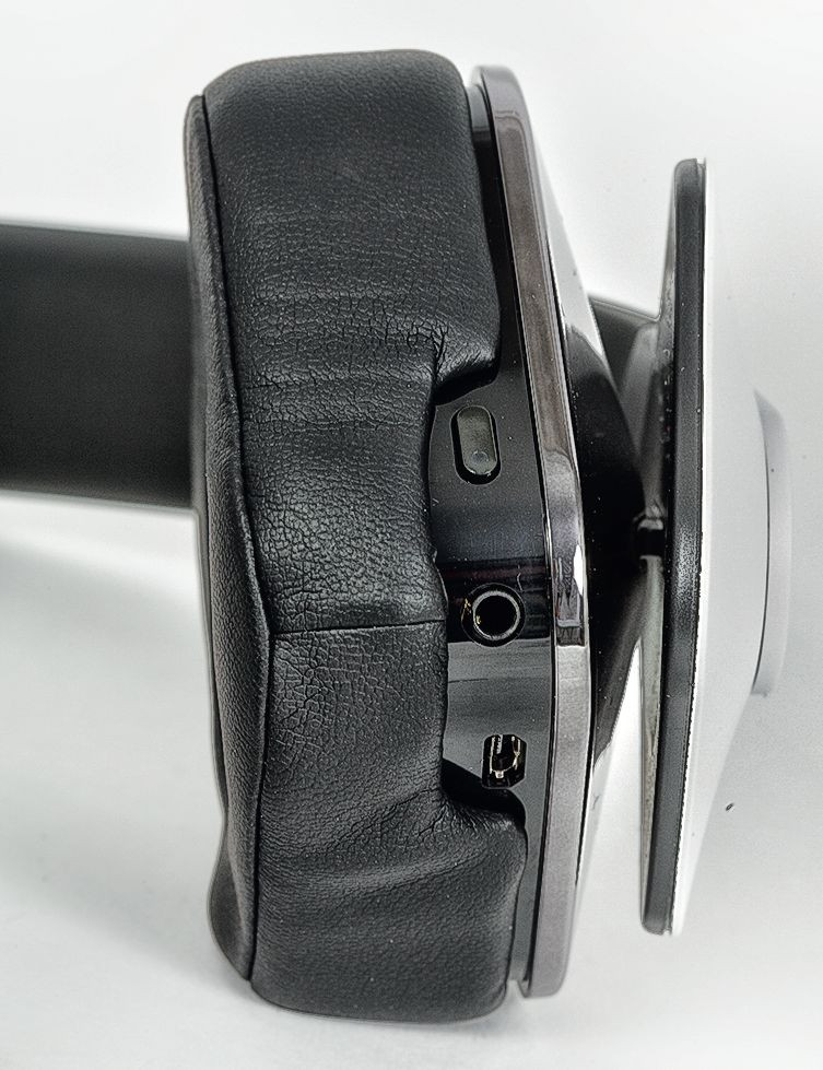 W dolnej części jednej muszli znajduje się gniazdo analogowe mini-jack oraz złącze USB, przez które naładujemy akumulatory (potrzebne do działania wibracji) oraz zaktualizujemy oprogramowanie słuchawek.