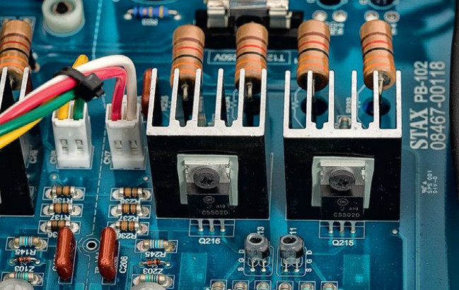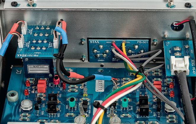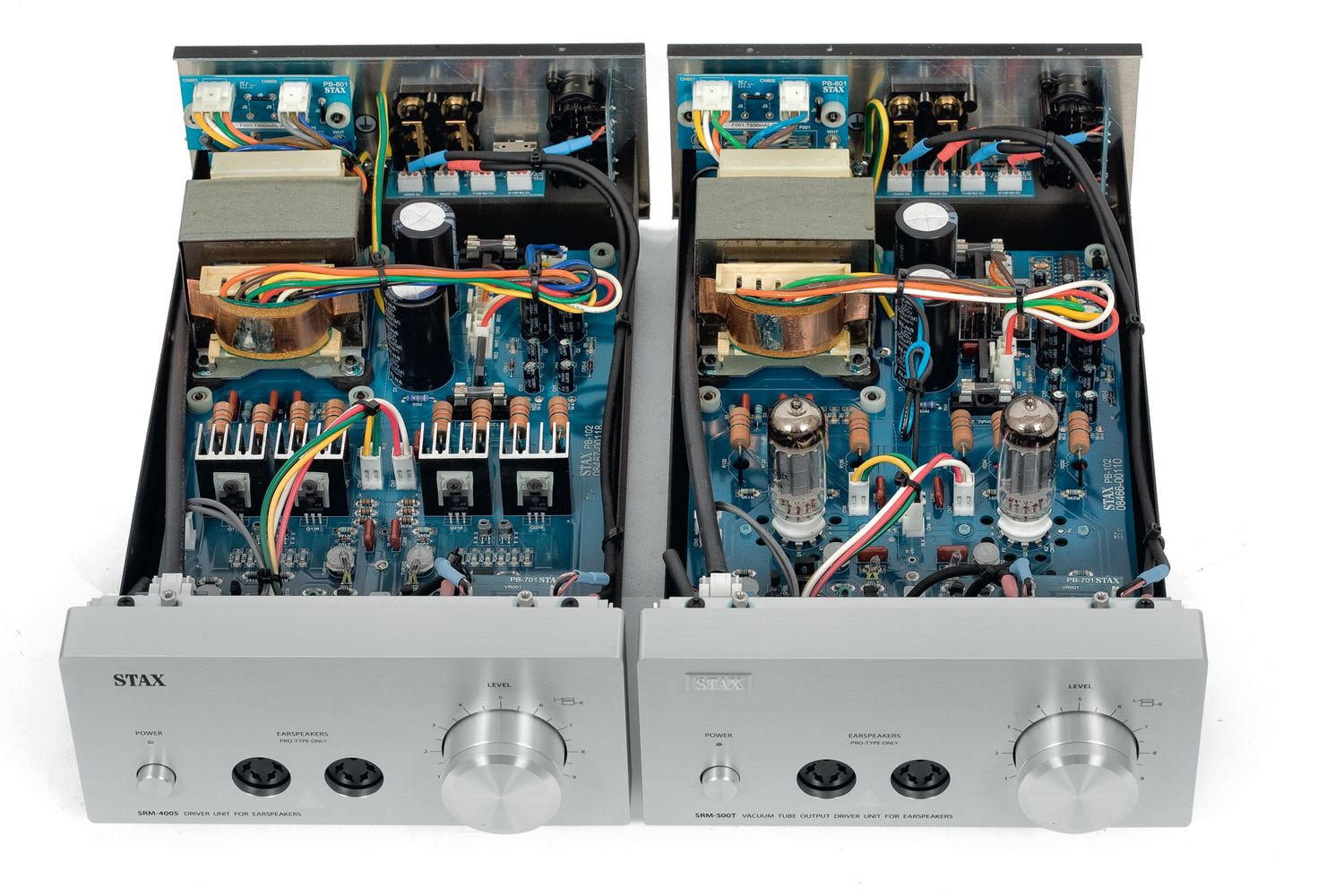Dalej sygnał trafia na główną płytkę. Zarówno SRM-400S, jak i SRM-500T mają dwa stopnie wzmocnienia. Pierwszy jest tranzystorowy, dokładnie taki sam w obydwu modelach, na FET-ach stosowanych przez Staxa od dawna i generalnie lubianych przez firmy japońskie.