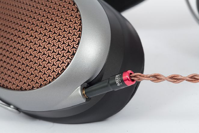 Meze Audio Poet są dopasowane kolorystycznie do tylnych kapselków muszli, estetyczne i elastyczne. Mają solidne wtyki od strony słuchawek i wzmacniacza – w fabrycznej wersji to standard 6,3 mm, ale niezależne wyprowadzenie z każdej muszli otwiera drogę do połączenia symetrycznego.
