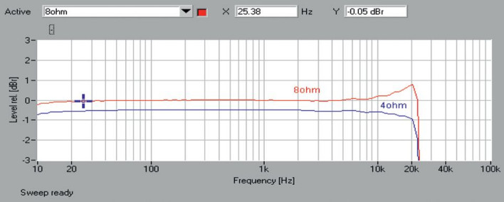 Pasmo przenoszenia (rys.1) dla 8 omów to niemal kopia Marantza, idealne niskie częstotliwości, wzbudzenie przy ok. 20 kHz i następujący po nim gwałtowny spadek. W tym przypadku możemy również obserwować zachowanie przy 4 ohm, nie ma już tendencji do wzbudzania, co potwierdza kalibrację filtrów wyjściowych do 4-omowej impedancji, ale sygnały powyżej 22 kHz są, tak czy inaczej, tłumione przez filtry wyjściowe.
