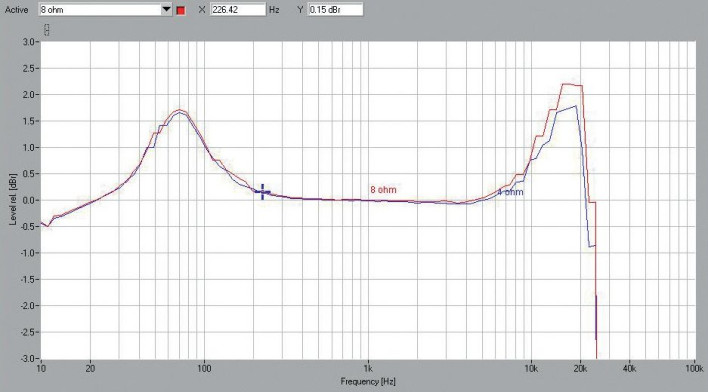 Wysoki poziom szumów (S/N to tylko 62 dB) wynika ze specyfi ki układu impulsowego, wraz z umiarkowaną mocą dynamika zatrzymuje się na niskim poziomie 75 dB. Podbicie w zakresie wysokich częstotliwości wynika zazwyczaj z działania filtrów wyjściowych (koniecznych w układach impulsowych) i jest zmienne w funkcji impedancji obciążenia, ale w tym przypadku wygląda podobnie dla 8 i 4 Ω (rys. 1).