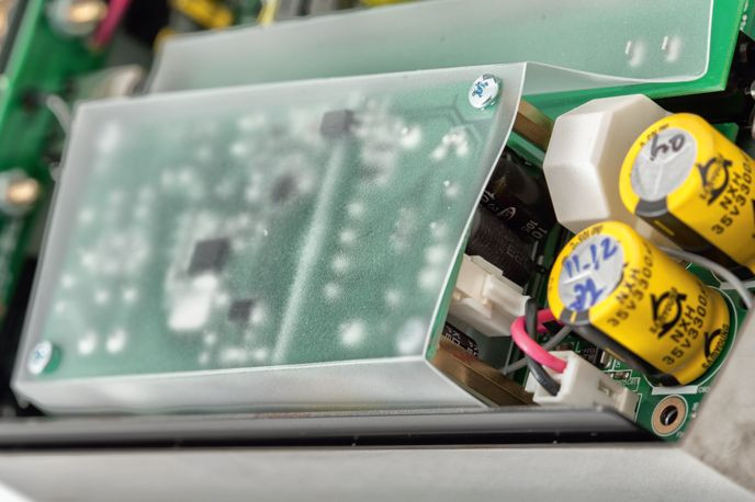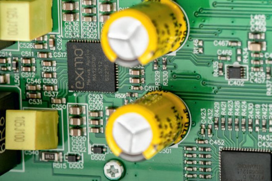 W pobliżu wejścia analogowego widać przetwornik A/C Burr Brown PCM1802 (24/96), który sugeruje, że przedwzmacniacz (z sekcją procesorów) jest cyfrowy. Te podejrzenia się potwierdzają, gdy napotykamy na wielozadaniowy układ scalony Merus Audio MA12070P.