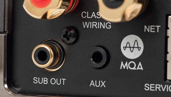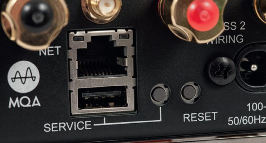Zaciski głośnikowe zaskakują solidnością (metalowe, z nakrętkami). Pomiędzy nimi zainstalowano gniazdo anteny Wi-Fi i złącze sieciowe LAN. Jest też USB-A, ale jedynie do funkcji serwisowych.
