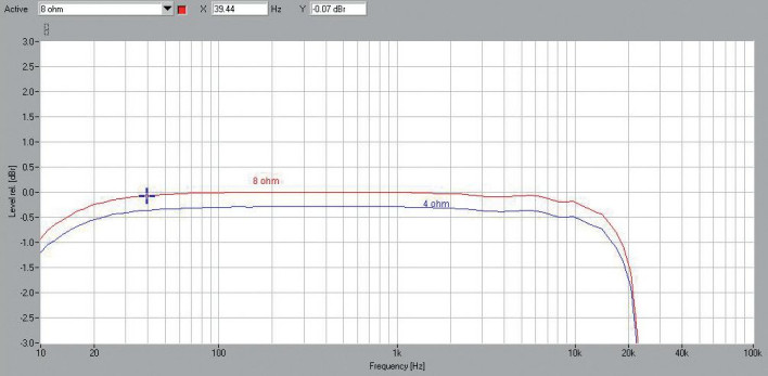 Charakterystyki częstotliwościowe (rys. 1) wyglądają nietypowo. Przy 10 Hz spadek wynosi 1 dB – to jeszcze nic, ale w zakresie wysokotonowym, na granicy pasma akustycznego, zbocze jest bardzo strome, a spadki -3 dB odczytujemy już przy 22 kHz.