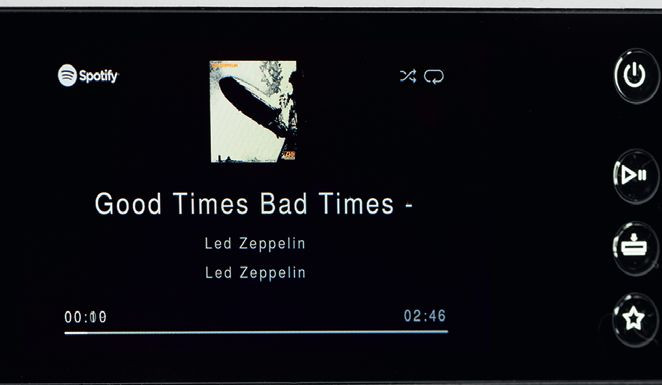 Na dużym wyświetlaczu obejrzymy okładki płyt i dodatkowe informacje o ścieżkach. Cztery przyciski sterujące służą najważniejszym funkcjom (są w wśród nich tzw. szybkie presety, pod którymi możemy zaprogramować np. ulubione stacje radiowe).