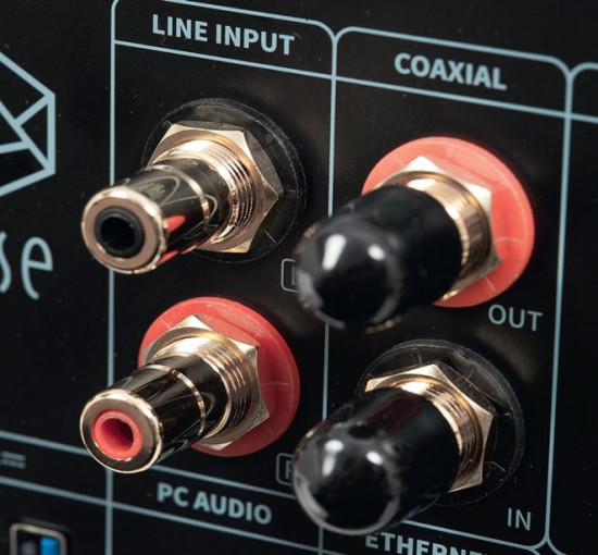 Obok wyjść głośnikowych zainstalowano sekcję z cyfrowymi gniazdami (wejścia i wyjścia) w standardach Toslink i S/PDIF. Wejście analogowe, liniowe (para RCA) jest tylko jedno. Skromnie, ale powinno wystarczyć, bo kto wszedł już w świat strumieniowy, zwykle porzuca tradycyjne urządzenia źródłowe. Dla jednego miejsce się znajdzie i może to być nawet gramofon… o ile na zewnątrz będzie preamp phono.
