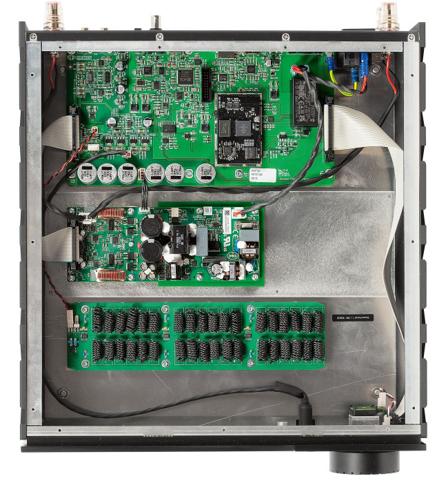 Wewnętrzna konstrukcja Axxess Forte 1 pokazuje podział na trzy sekcje. W ciemno obstawialibyśmy pewnie przedwzmacniacz (z sekcją cyfrową), końcówkę mocy i zasilacz. Podziały wyglądają jednak inaczej.