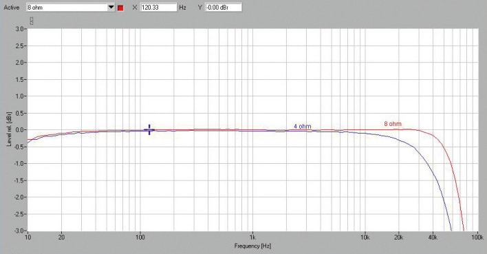 Firmowa specyfikacja jest dość ogólnikowa – informuje jedynie o mocy 2 x 100 W przy 8 Ω. W dodatku informacja ta nie przystaje do rzeczywistości, co w tym przypadku tylko nas cieszy, bowiem zmierzone możliwości Forte 1 są znacznie większe.