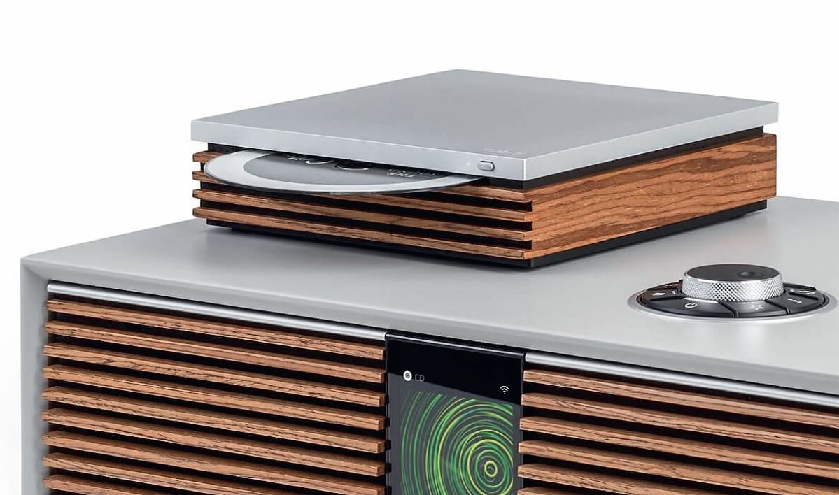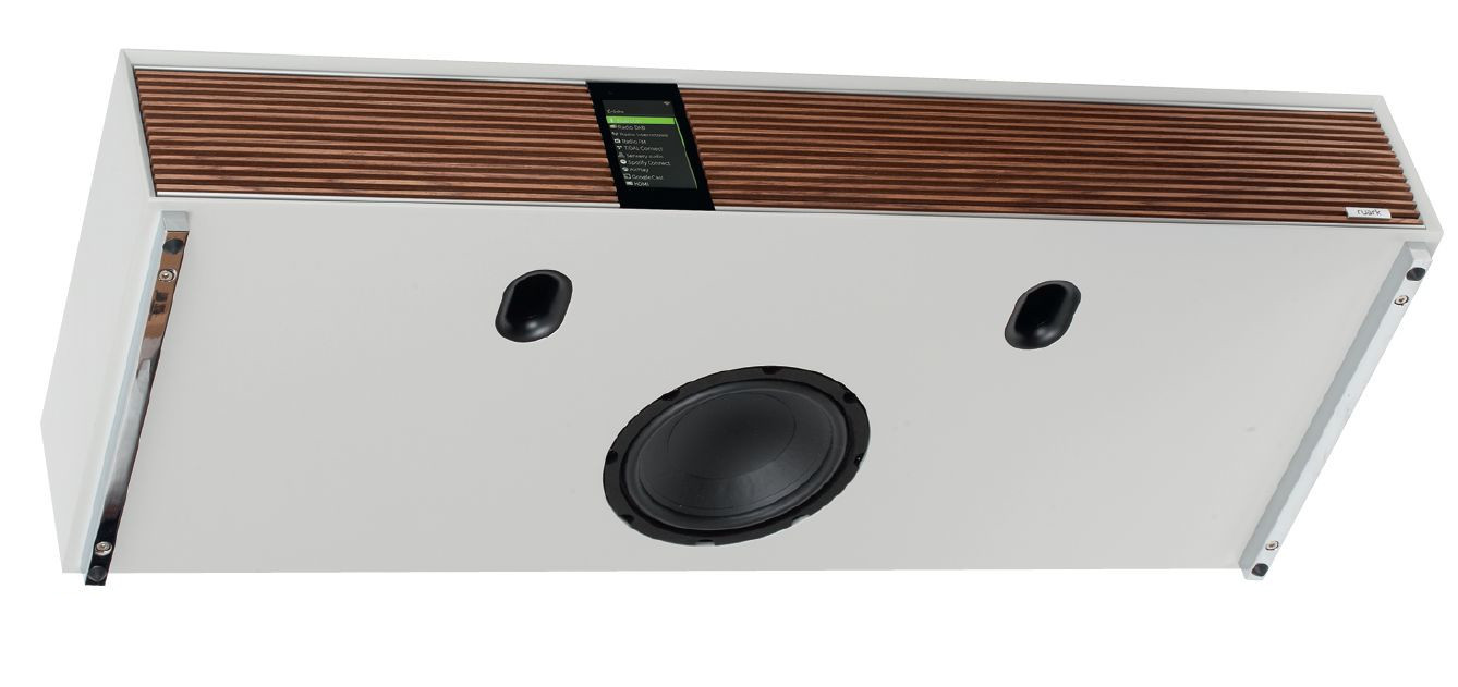 Na górnym, głębokim blacie obudowy można nawet coś położyć. Większą część obudowy oklejono naturalnym fornirem, jest też wersja polakierowana na szaro (Soft Grey), przednią ściankę pokrywa "szczebelkowa" maskownica.