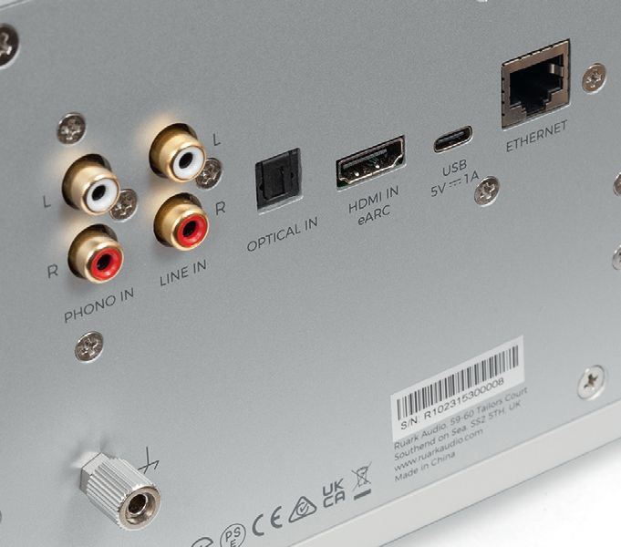 Ruark Audio R810 ma także kilka wejść kablowych: trzy cyfrowe (optyczne, HDMI z eARC oraz USB dla nośników pamięci) oraz dwa analogowe; jedno z nich przyjmuje sygnały liniowe, drugie jest wyposażone w przedwzmacniacz phono (dla wkładki MM).