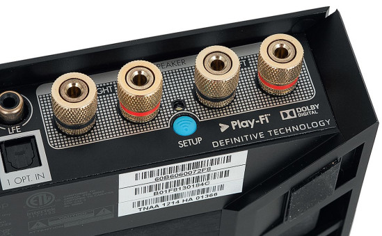 Pomiędzy gniazdami głośnikowymi znajduje się przycisk do komunikacji z routerem. Połączenie z siecią można też ustanowić za pomocą wsparcia systemu iOS. Do tego celu nadaje się także jedna z funkcji Play-Fi, jeśli oprogramowanie jest zainstalowane na urządzeniu sterującym, to W Amp jest znajdowany natychmiast po włączeniu.
