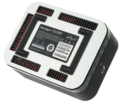 Paradigm PW Amp wzmacniacz to niewielki, czarny prostopadłościan o zaokrąglonych narożnikach. Boki i góra obudowy są plastikowe, ale podstawa jest metalowa. Pięć przycisków funkcyjnych znajduje się na niewielkim, ulokowanym z przodu pasku.
