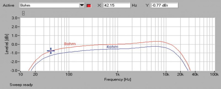 Taga ma również niewielkie problemy w zakresie pasma przenoszenia (rys.1), być może kalibracja układów korekcji tonalnej nie jest idealna, stąd spadek w rejonie niskich i lekkie podbicie w obszarze wysokich rejestrów. Spadki -3 dB możemy wyznaczyć przy ok. 16 Hz i 30 kHz.
