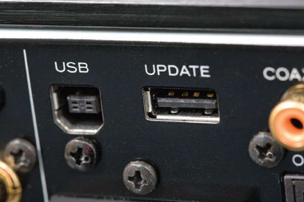 Obydwa wejścia USB z tyłu: jedno jest wejściem na wbudowany przetwornik C/A, drugie służy tylko do aktualizacji oprogramowania.