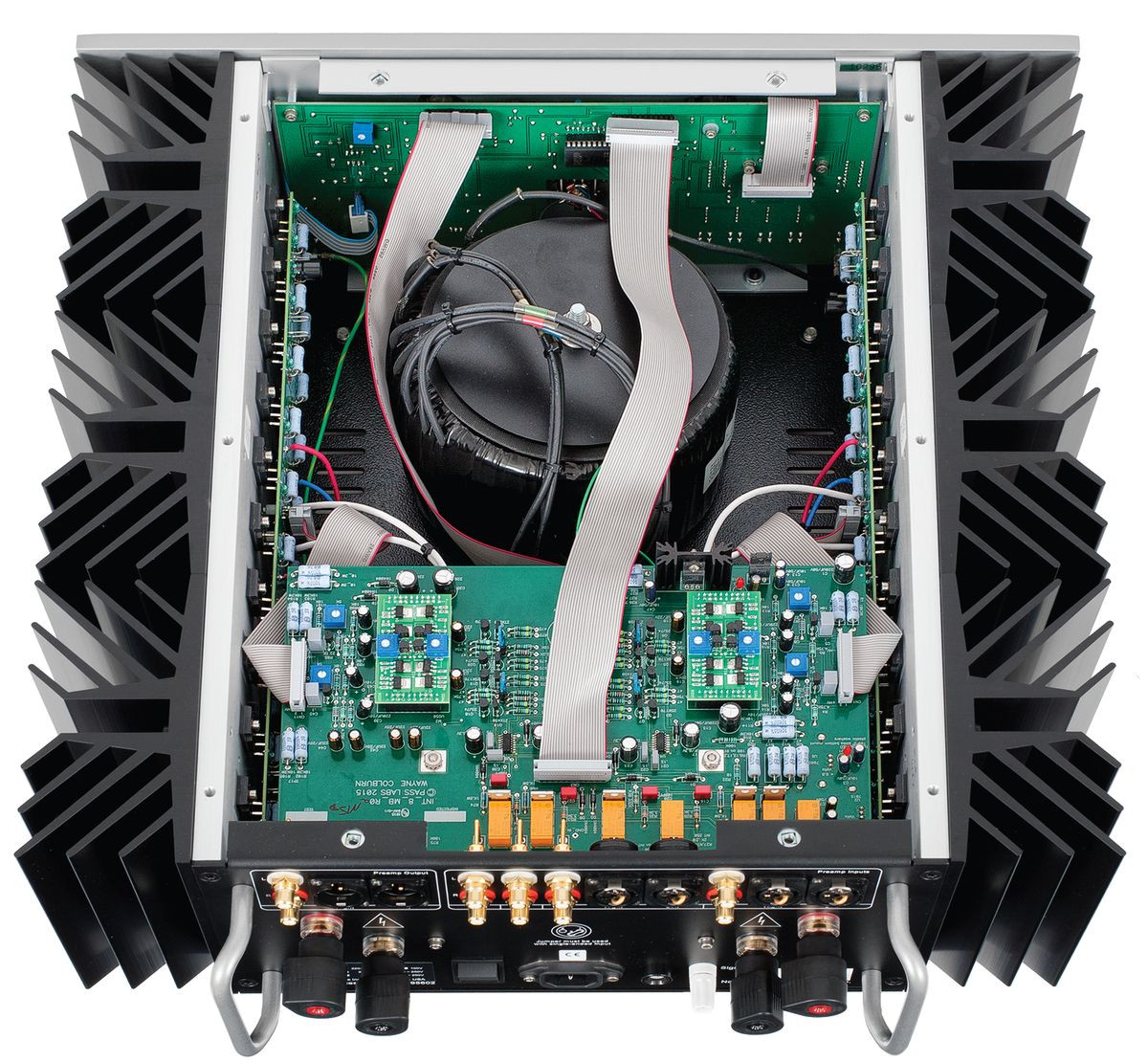 Bloki w oczywisty sposób rozdzielono na stronę lewą i prawą, każda ma własną płytkę drukowaną oraz, uwaga, aż 20 (dwadzieścia) tranzystorów Mosfet. Podstawą zasilania jest ogromny transformator toroidalny. Pozostałe obwody zasilające przeniesiono na płytkę w pobliżu tylnej ścianki, na samym dole obudowy.