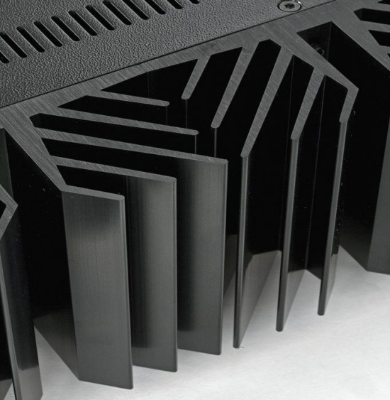 Grubość frontu dodatkowo wyeksponowano odcinając go srebrnym kolorem od czerni pozostałych elementów. Radiatory są efektownie wyróżnione, wypełniając obydwie boczne ścianki; mamy tutaj popis precyzyjnej obróbki i finezyjnego kształtu - co jednak ma służyć przede wszystkim zamontowanej wewnątrz elektronice.