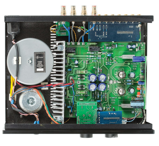Jest jednak drugi, mniejszy transformator, zarezerwowany dla lampowej sekcji urządzenia. Obydwa przykręcono do dolnej płyty i odseparowano od elektroniki audio dużym radiatorem końcówek mocy.