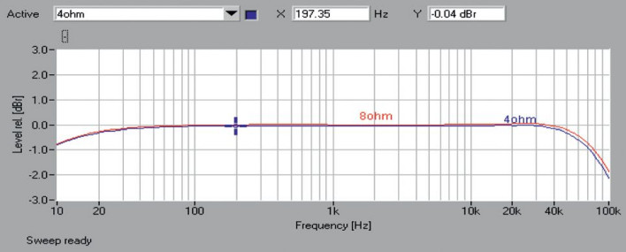 W pasmie przenoszenia (rys.1) nie widać nic niepokojącego, przy 10 Hz spadek wynosi -0,8 dB, a przy 100 kHz -1,9 dB dla 8 Ω oraz -2,1 dB dla 4 Ω. Choć w spektrum zniekształceń (rys. 2) można zaobserwować trzecią oraz piątą harmoniczną, to ich poziom jest bardzo niski i nie przekracza -90 dB.