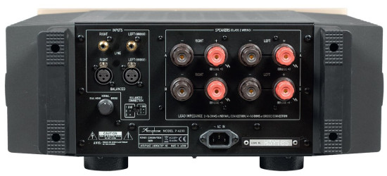 Na zewnątrz wyślemy jednym lub dwoma (bi-wiring lub bi-amping) parami potężnych gniazd głośnikowych. Sama końcówka może pracować w klasycznym układzie stereofonicznym, jako dwa równoległe wzmacniacze, pozwalające napędzić kolumny w trybie bi-amping (sygnał doprowadzamy wówczas pojedynczym kablem) lub mostkowym, w którym moc wzrasta dwukrotnie.