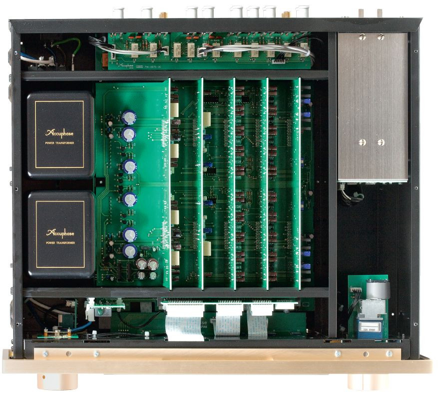 Accuphase C-2120 napakowano wieloma modułami. Główny składa się z podstawowej, dużej płytki na dnie i wpiętych do niej czterech płytek z układem AAVA. To kolejna, chyba już czwarta jego wersja, kiedyś spotykana wyłącznie w topowych przedwzmacniaczach firmy.