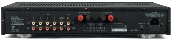 Audio Analogue Crescendo działa wyłącznie na sygnałach analogowych i tutaj przepychu też nie ma. Cztery gniazda dla źródeł z sygnałami liniowymi pewnie wystarczą, piąte może zostać przełączone w tryb ByPass z pominięciem przedwzmacniacza (aby wprowadzić sygnał bezpośrednio do końcówek mocy). Nie ma wejścia dla gramofonu. Jest wyjście ze stałym poziomem (dla magnetofonu?).