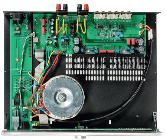 Takie oszczędne rozwiązania pozwoliły jednak na uzyskanie bardzo krótkiej ścieżki sygnałowej, a zaletą scalonych przełączników źródeł jest również absolutnie bezgłośna praca. Chociaż kondensatory filtrujące w zasilaczu nie są potężne (2 x 4700 ηF), to widać duży, porządny transformator zasilający.