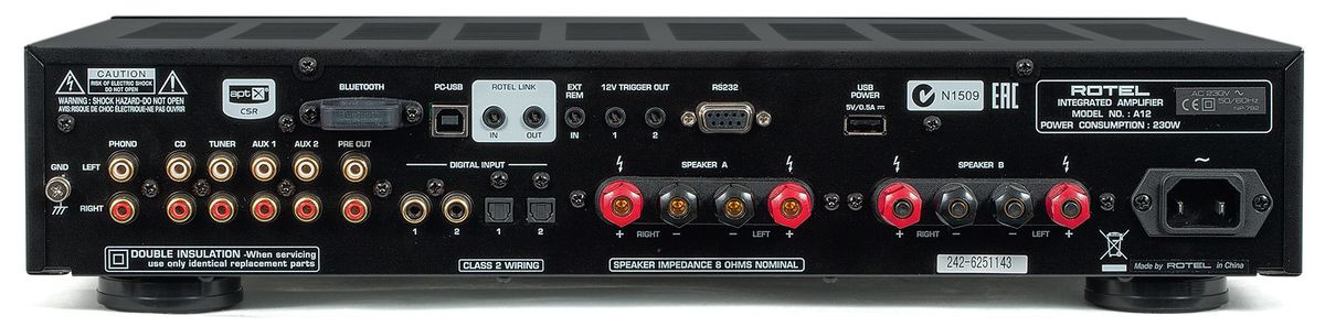 W wielu wzmacniaczach z poprzednich generacji Rotel stosował USB z możliwością rozbudowy o adapter Bluetooth; chociaż miniaturowy, to przeciętnie wygodny. Teraz BT został zainstalowany na stałe, widać go z tyłu w formie niewielkiej kostki (z plastikową obudową). Wzmacniacz przygotowano także do pracy instalacyjno-systemowej, ma więc RS232, wyzwalacze i firmowy system sterowania Rotel Link.