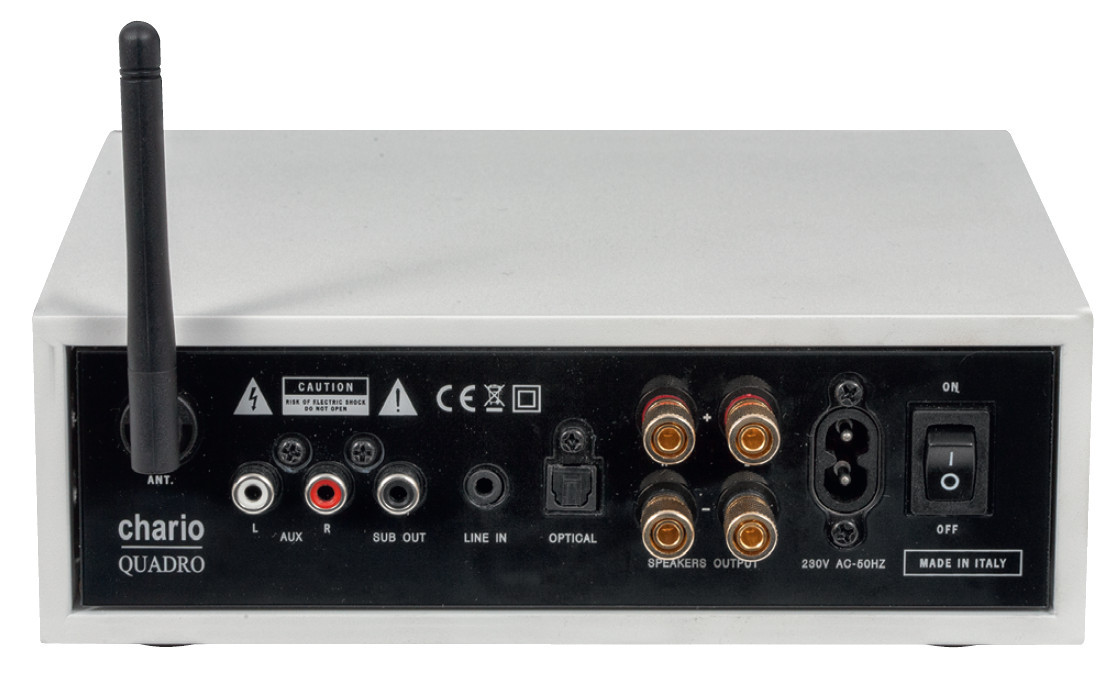 Chario Quadro ma również wejścia analogowe, jedno RCA i jedno mini-jack, a ponadto monofoniczne wyjście dla subwoofera. Zaciski głośnikowe są przyzwoite. Antenka Bluetooth została zamocowana na stałe.