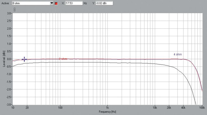 Skupmy się już na bazowych krzywych, czerwonej (8 Ω) i niebieskiej (4 Ω). Pomiar dla obydwu obciążeń daje idealnie zbieżne wyniki, przy 10 Hz spadku praktycznie nie ma (-0,1 dB), przy 100 kHz wynosi ok. -2 dB, co należy uznać za świetny rezultat.