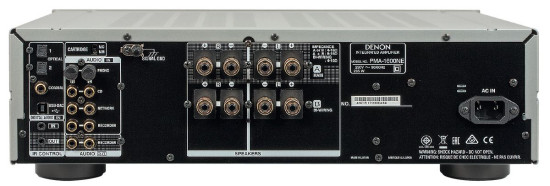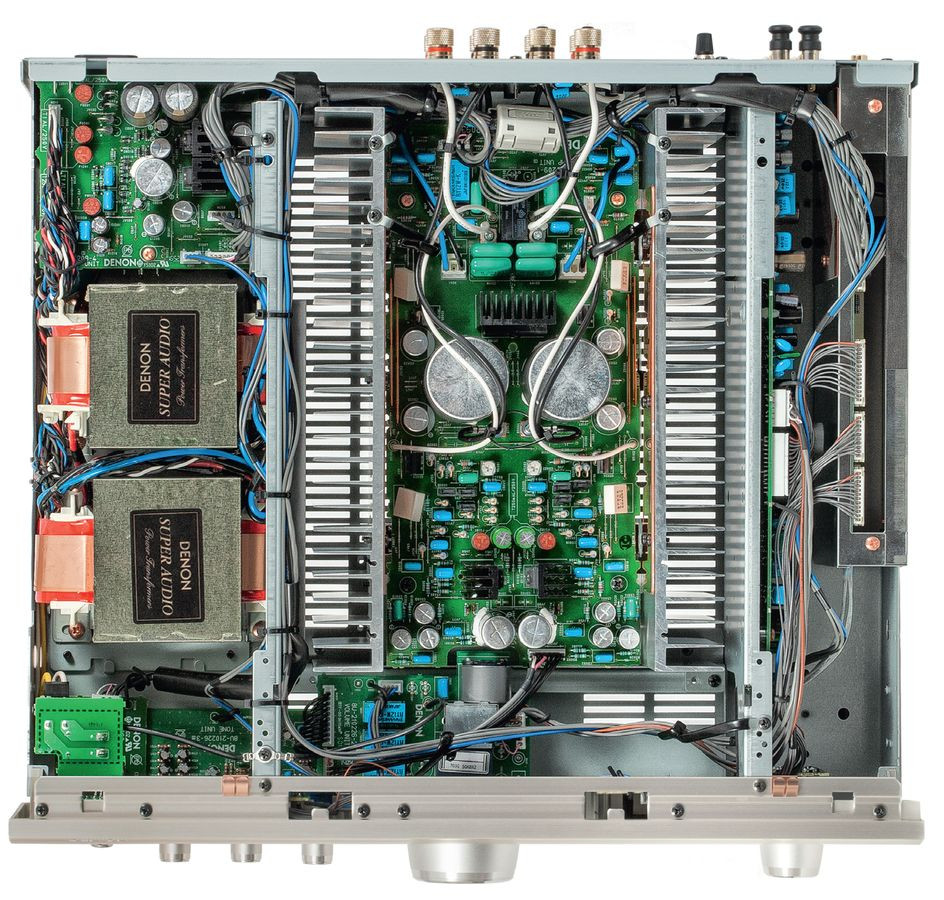 W centrum dostępnej przestrzeni znajdują się końcówki mocy z dwoma długimi radiatorami; w ten sposób oddzielono od siebie obydwa kanały. Końcówki mocy Denon nazywa (w pełnym brzmieniu) Advanced Ultra High Current MOS Single Push-Pull Circuit.